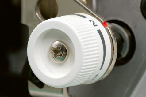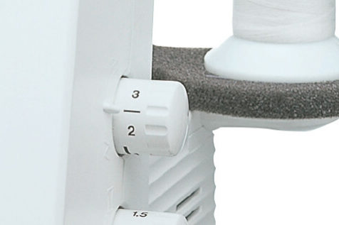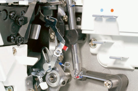 Das Einstellen der Fadenspannung ist immer eine knifflige Sache. Gerade wenn eine Naht einmal nicht genauso aussieht wie gewünscht. Damit es trotzdem einfach ist, die Spannung für den richtigen Faden anzupassen, hat die MO-214D für die Greifer- und für die Nadelfäden verschiedene, übersichtlich angeordnete Fadenspannungen. An diesen Stellknöpfen ist zusätzlich noch aufgedruckt, für welchen Faden dieser zuständig ist. Außerdem ist die Grundeinstellung der jeweiligen Fadenspannung hervorgehoben, sodass Sie diese jederzeit selbständig wiederherstellen können.