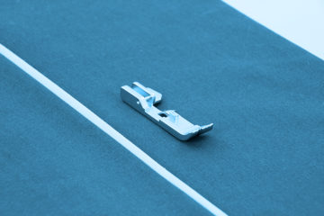 Dieser Fuß verfügt über eine speziell eingearbeitete Führungsnut auf der Fußunterseite. In dieser Nut wird das Paspelband oder der Keder exakt geführt. Man kann somit Paspelband professionell zwischen zwei Stofflagen einnähen oder eine Kederschnur einfassen.